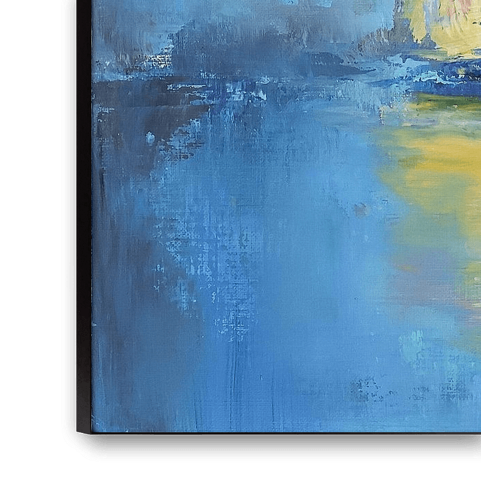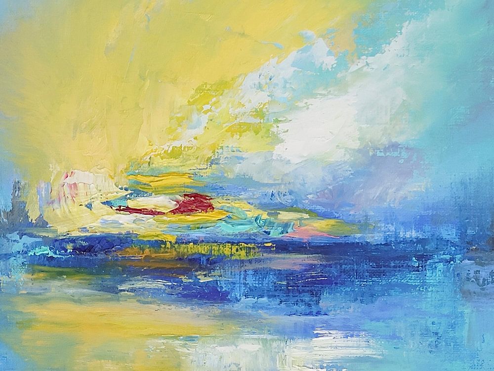Ein leuchtender Ausbruch von gelbem und weißem Licht strahlt über den Horizont und geht nahtlos in ruhige Blau-, Violett- und Rottöne über. Die fließenden Pinselstriche erzeugen einen Spiegeleffekt auf der Wasseroberfläche, der ein Gefühl von Gelassenheit, Erneuerung und stiller Stärke hervorruft.