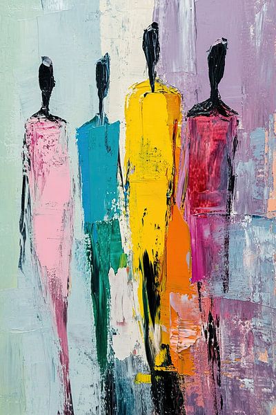 Abstrakte Menschen - Auf diesem abstrakten Gemälde sehen Sie vier Menschen in leuchtenden Farben wie Gelb, Blau und Rosa mit dunklen Silhouetten, die dem Kunstwerk einen lebendigen und modernen Look verleihen.