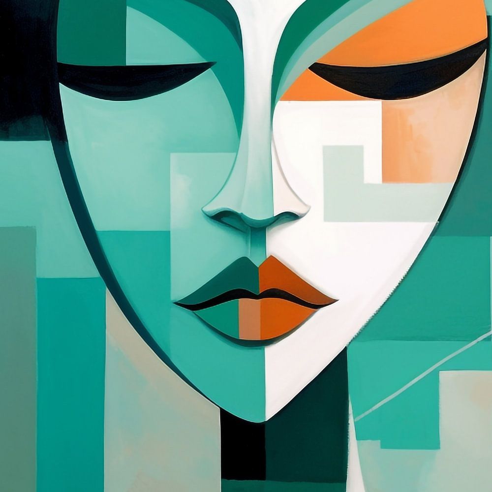Ein Ölgemälde auf Leinwand zeigt eine Frau in einem abstrakten Stil mit Einflüssen aus der geometrischen abstrakten Kunst. Die Farbpalette besteht aus dunklem Smaragdgrün und hellem Cyan, die eine fesselnde visuelle Harmonie schaffen. Ihr Porträt ist vereinfacht und stilisiert, mit einer detaillierten Charaktergestaltung, die ihre Persönlichkeit zum Leben erweckt. Orange- und cyanfarbene Akzente verleihen dem Gemälde Tiefe und Energie.