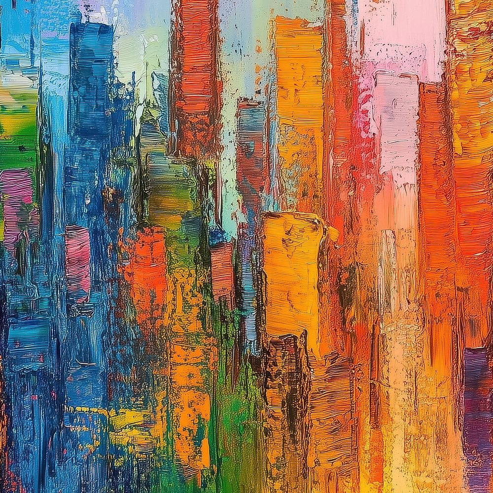 Dieses abstrakte Stadtgemälde ist ein beeindruckendes Kunstwerk, das auf abstrakte Weise die Dynamik und Energie einer Stadt zum Leben erweckt. Mit fließenden Linien, geometrischen Formen und einem mehrschichtigen Einsatz von Farbe evoziert dieses Gemälde das Gefühl städtischer Bewegung und architektonischer Struktur, ohne sich auf eine erkennbare Skyline festzulegen.