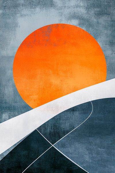 Bestelle diese Malerei Abstrakte Szenerie mit orangefarbener Sonne von Poster Art Shop als Reproduktion auf Leinwand, Alu-Dibond, als Poster, Fototapete oder Acrylglasbild.