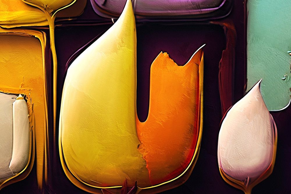 Bunte abstrakte Tulpen im Stil des Kubismus, Gemälde in Mischtechnik.