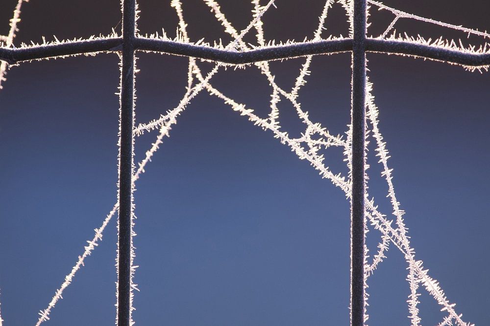 Modernes abstraktes Foto eines frostbedeckten Zauns mit Spinnennetz, das von der frühen Morgensonne hinterleuchtet wird. Interessante und zarte Muster aus einer kalten Winterlandschaft mit weichen Blautönen einzufangen.