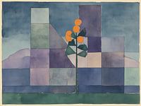 Dieses Gemälde zeigt eine abstrakte Landschaft, die aus sanften, geometrischen Flächen in Blau-, Violett- und Grüntönen besteht. In der Mitte steht eine stilisierte Pflanze mit runden, orangefarbenen Früchten, die einen warmen Kontrast zum kühlen Hintergrund bildet. Die Formen erinnern an eine Stadt oder eine hügelige Landschaft,…