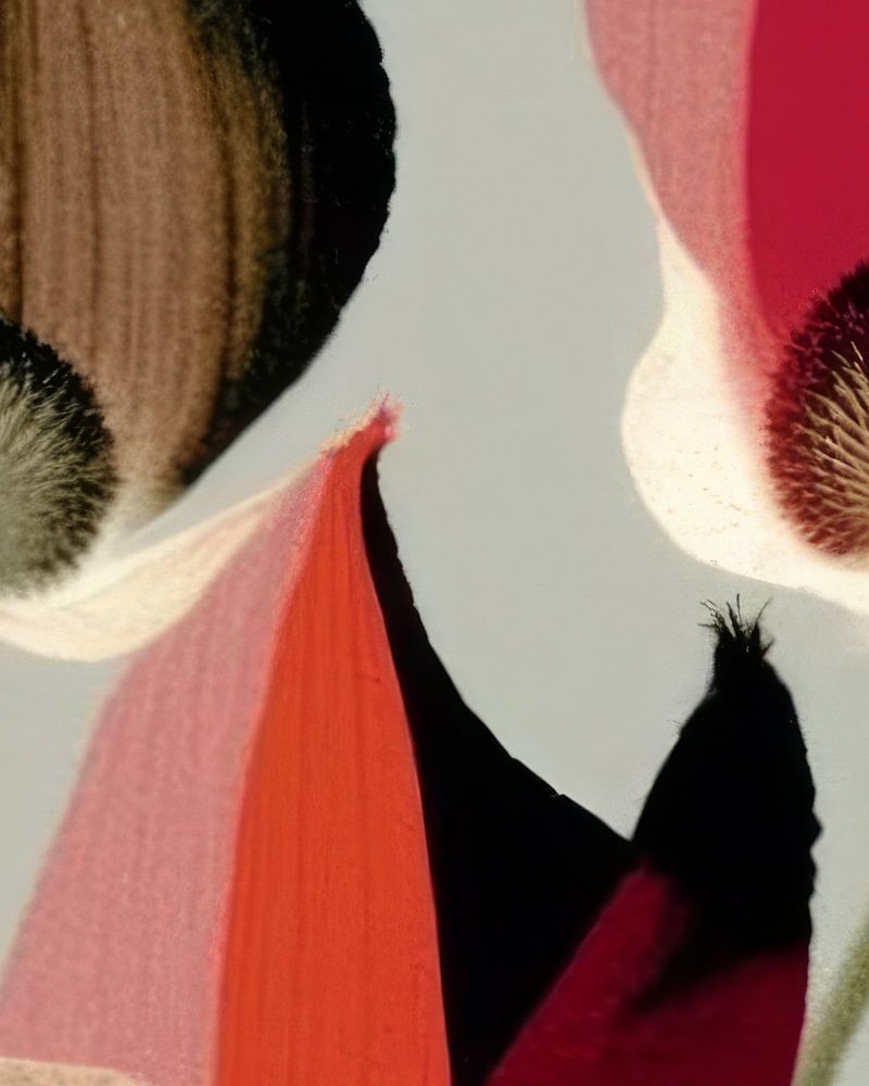 Abstrakte und farbenfrohe Blumen vor einem neutralen Hintergrund. Ein außergewöhnliches Werk für Ihre Wand! In Schattierungen von Rosa, Grün, Braun, Orange und Rot.