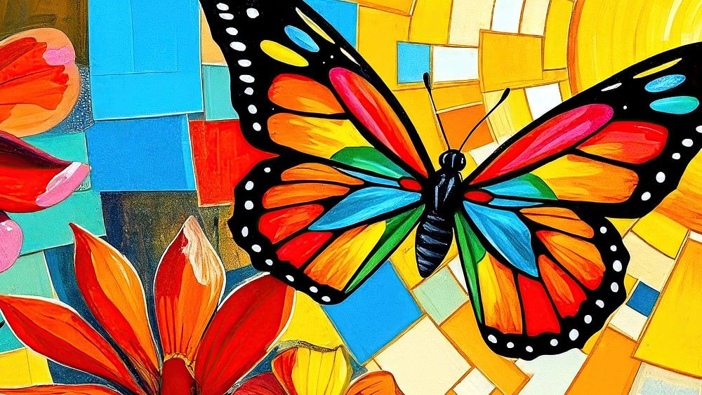 Im linken Teil des Bildes erkennt man farbige Blumen mit großen Blüten, im oberen rechten Bildraum flammt eine strahlende Sonne auf: ein Zentrum aus Wärme und Energie, das von tiefem Karminrot über sattes Orange in ein intensives Gelb übergeht. Ihre Strahlen tauchen die gesamte Szene in ein vibrierendes Licht, das die Grenzen zwischen Form und Fläche auflöst. In diesem Licht gleitet ein farbenprächtiger Schmetterling durch die Komposition – ein Symbol für Transformation, Leichtigkeit und die poetische Kraft der Natur.