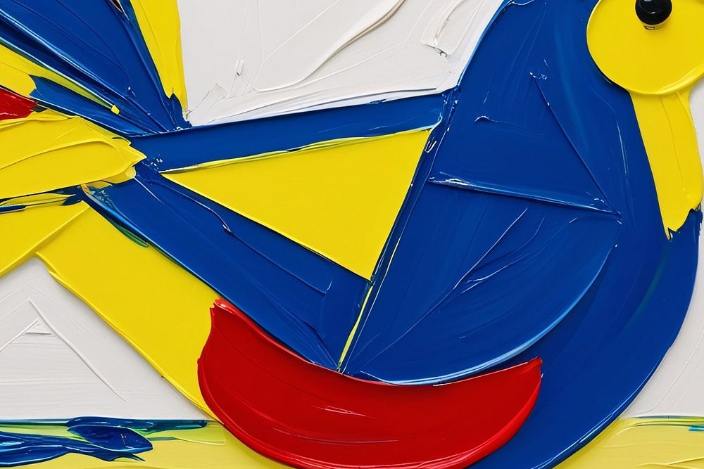 Dieses farbenfrohe Design erweckt einen abstrakten Vogel in lebhaften geometrischen Formen zum Leben. Mit leuchtenden Farben wie Gelb, Blau und Rot scheint der Vogel Energie und Bewegung auszustrahlen. Die dicken Pinselstriche und die Verwendung heller, kontrastreicher Farbtöne verleihen dem Werk einen modernen und verspielten Look, während der einfache Hintergrund dafür sorgt, dass der Vogel im Mittelpunkt der Komposition steht. Es wäre eine auffällige Ergänzung für jeden Raum, sei es das Schlafzimmer, das Esszimmer oder jeder andere Ort, der einen kreativen Impuls gebrauchen könnte. Dieses Design ist perfekt für Liebhaber moderner Kunst und geometrischer Abstraktionen und bringt sofort Farbe und Charakter in jede Umgebung.