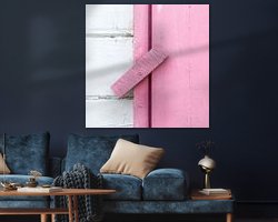 Abstrakte Darstellung eines pastellrosa Holzscharniers in einer Türstruktur.