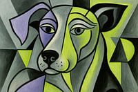 Dieses kubistische Hundeporträt fängt einen Hund mit kraftvollen geometrischen Formen und verspielten Flächen ein. Große Dreiecke, geschwungene Linien und enge Konturen wechseln sich ab, während Lila und Grün einen lebhaften Kontrast zu weichen Grautönen bilden. Während ein Auge ruhig und konzentriert wirkt, wird das andere von…