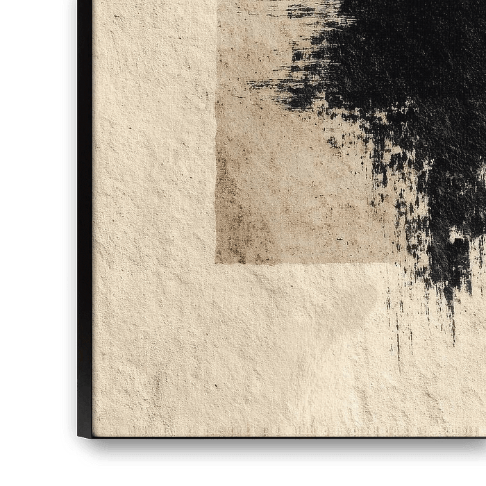 Ein minimalistisches, modernes Ink-Wash-Kunstwerk auf beigem Papier. Die elegante schwarze Quadratkomposition wird durch grungeartige Texturen und weiche Kanten ergänzt, wodurch Tiefe und Charakter entstehen. Mit neutralen Tönen, einfachen Formen und reduzierter Farbpalette vermittelt das Werk eine subtile Vintage-Ästhetik. Hochauflösende, hyperrealistische Details heben die Struktur und Textur hervor, während der minimalistische Stil Klarheit, Eleganz und Ruhe ausstrahlt. Dieses abstrakte Design verbindet klassische Ink-Wash-Technik mit zeitgenössischer Ästhetik und eignet sich ideal für moderne Innenräume, digitale Projekte oder hochwertige Drucke.