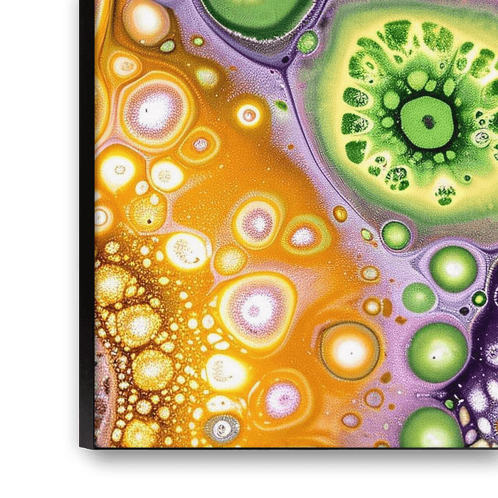 Dieses einzigartige Kunstwerk strotzt nur so vor Lebendigkeit mit seiner Explosion von leuchtenden Farben und organischen Mustern. Seine fließenden Formen und dynamischen Linien bringen Energie und Bewegung in jeden Raum, in dem es platziert wird. Dieses Gemälde eignet sich perfekt für moderne Innenräume und verleiht ihnen einen Hauch von abstraktem Ausdruck, der sowohl visuell ansprechend als auch faszinierend ist. Ideal für Büros, Wohn- oder Schlafzimmer, wo ein Hauch von Kreativität und Farbe gewünscht wird. Lassen Sie sich von diesem Kunstwerk inspirieren und verschönern Sie Ihren Raum mit seinem verspielten und doch raffinierten Look.