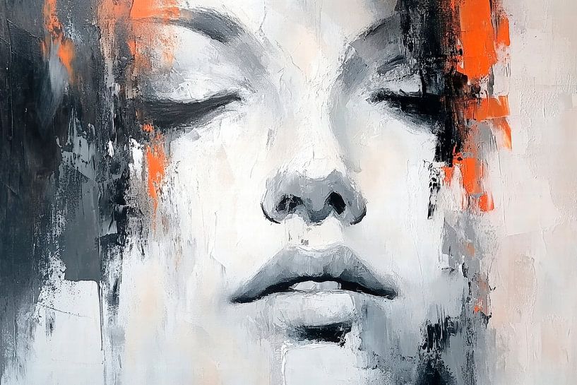 Ein sanftes Spiel aus Grautönen und lebhaftem Orange entfaltet sich in diesem ausdrucksstarken Kunstwerk. Die geschlossenen Augen und die traumverlorene Miene vermitteln Ruhe und Introspektion. Ideal für das Schlafzimmer oder das Wohnzimmer, fügt es jedem Raum eine melancholische Eleganz hinzu und lädt zum Träumen und Verweilen ein.