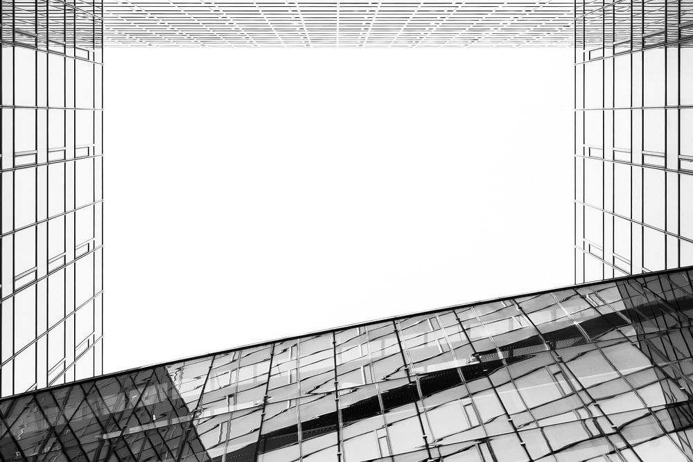Abstraktes Detail mit Blick durch eine Öffnung im Dach des Hauptbahnhofs Utrecht auf die städtischen Büros. Die Linien des blauen Glases des Daches und des weißen Stadtbüros erregten meine Aufmerksamkeit. Ich habe es in Schwarz-Weiß gemacht, damit die Linien noch besser zur Geltung kommen.