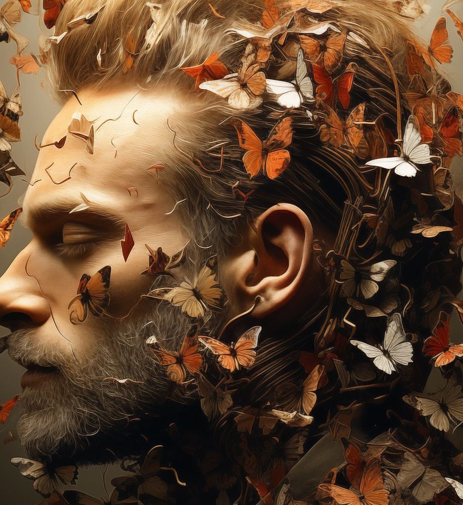 abstraktes Werk eines Mannes mit mehreren Schmetterlingen um ihn herum.
