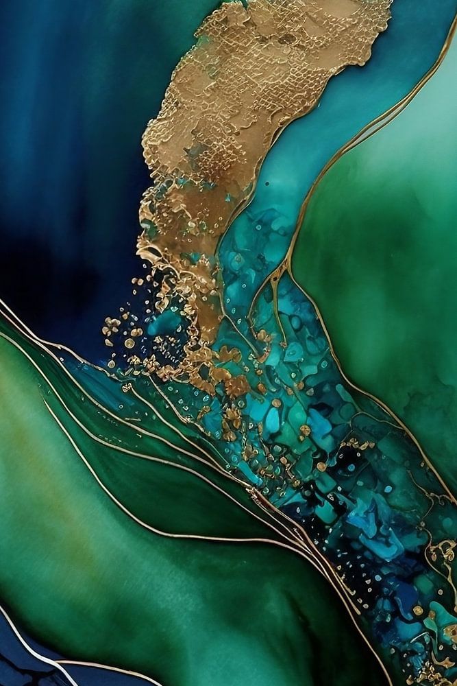 Ein abstraktes Bild mit einem Effekt aus Farbe, Tinte und Alkohol, das ich mit blauen und grünen Farben, sowohl hell als auch dunkel, hier und da mit einigen Goldtönen, bearbeitet habe.