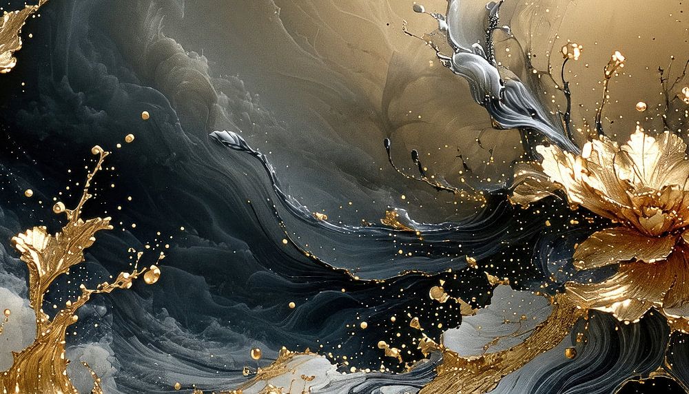 Inmitten dieses dynamischen Farbflusses beginnt das Gold, sich zu formen – es versucht, florale Gestalten hervorzubringen. Nur eine einzelne goldene Blüte scheint sich im rechten Bildteil vollendet zu haben – zart, leuchtend, fast wie ein Versprechen im Entstehen. Die übrigen Formen bleiben in ihrer Entfaltung begriffen, als würde das Bild selbst noch wachsen.