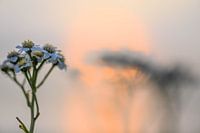 Nahaufnahme einer sommerlichen weißen Wildblume, der Achillea, mit einer weiteren Blüte im Hintergrund, die durch das große Zwerchfell verwischt wird.