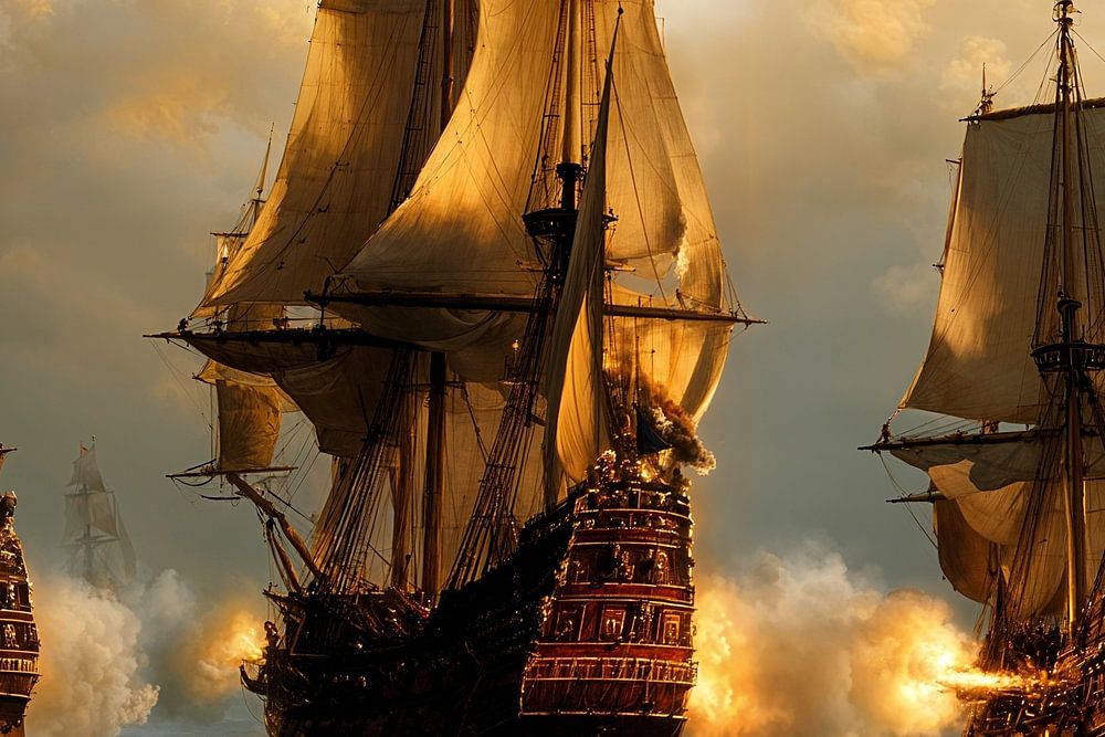 Im Mittelpunkt der Darstellung stehen drei mächtige Schiffe, die sich im erbitterten Gefecht befinden und mit donnernden Kanonen aufeinander feuern. Rauchwolken steigen aus den Geschützen empor und vermischen sich mit den Segeln, während das Meer von heftigen Wellen aufgewühlt wird. Die detailreich dargestellten Schiffe tragen stolz ihre Flaggen und Banner, wobei die niederländische Flotte unter Admiral Michiel de Ruyter bereits sichtbar die Oberhand gewinnt. Im Hintergrund sind weitere Schiffe zu erkennen, die in das Kampfgeschehen verwickelt sind, während am Horizont ein dramatischer Himmel mit Wolkenformationen und Lichtspielen die Dramatik der Szene verstärkt.