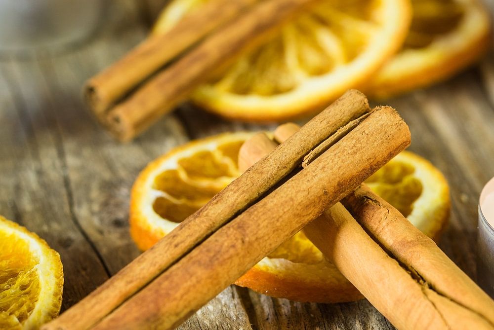 Komposition für die Advents- und Weihnachtszeit mit Kerzenflammen, Orangenscheiben, Zimt und Plätzchen in Sternform