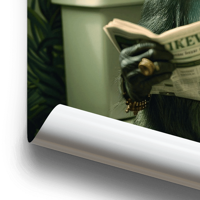 Ein nachdenklicher Affe, der auf einer Toilette sitzt und Zeitung liest, umgeben von tropischem Dekor.