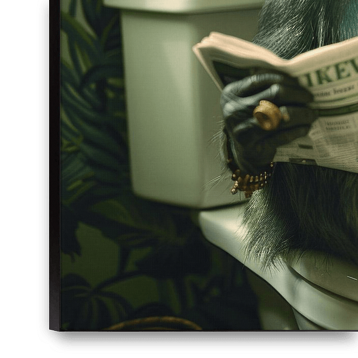 Ein nachdenklicher Affe, der auf einer Toilette sitzt und Zeitung liest, umgeben von tropischem Dekor.