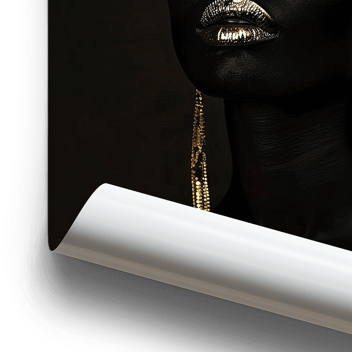 Diese atemberaubende Fotografie fängt die Essenz der afrikanischen Eleganz und Anmut ein. Mit goldenen Akzenten, die auf Lippen, Augen und Schmuck strahlen, präsentiert sich das Modell wie eine Göttin. Die Kombination aus tiefem Schwarz und glänzendem Gold erzeugt einen faszinierenden Kontrast, der die natürliche Schönheit und Würde der…