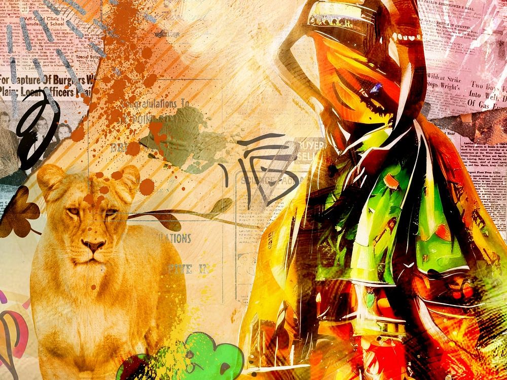 Als Künstlerin bin ich sehr stolz auf das Werk "African Queen", ein sehr detailliertes Mixed-Media-Werk, in dem eine schöne afrikanische Frau zusammen mit einer starken Löwin die Hauptrolle spielen darf. Dieses mit farbenfrohen, afrikanisch angehauchten Elementen verzierte Mischtechnikwerk entstand aus meiner Faszination für die Schönheit und Stärke der afrikanischen Frau und der Tiere, die auf diesem wunderschönen Kontinent leben. Das Werk zeigt ein sehr detailliertes Porträt einer afrikanischen Frau, die in ihrer ganzen Pracht und Würde dargestellt ist. Ihre Pose ist stark und entschlossen, strahlt aber auch Ruhe und Weisheit aus. Um sie herum sind verschiedene symbolische Elemente zu sehen, darunter Blumen, afrikanische Vasen, eine Sonne und ein gezeichneter Elefantenkopf. Die Blumen symbolisieren die Schönheit und Zerbrechlichkeit des Lebens, während die Vasen die reiche Geschichte und Kultur Afrikas darstellen. Die Sonne symbolisiert die Energie und Vitalität des Kontinents und seiner Menschen. Der Elefantenkopf steht für die Stärke und Intelligenz dieser majestätischen Tiere, die wie die afrikanische Frau eine wichtige Rolle in der afrikanischen Kultur spielen. Das gesamte Werk ist auf einer terrafarbenen, bemalten Unterlage gefertigt, die auf die Erdtöne Afrikas verweist. Darüber wurden Zeitungsartikel, Farbe, Bilder einer Löwin und mehr angebracht. Dadurch erhält das Werk eine Schichtung und Tiefe, die den vielen Facetten Afrikas gerecht wird. Es ist ein farbenfrohes Werk geworden, in dem sich die vielen Elemente zu einem harmonischen Ganzen zusammenfügen. Dieses Werk verdient es, in einem großen Format gedruckt zu werden, damit der Betrachter alle Details und die Symbolik entdecken kann. Es ist eine Hommage an die Stärke, Schönheit und Weisheit der afrikanischen Frau und ihrer Kultur.