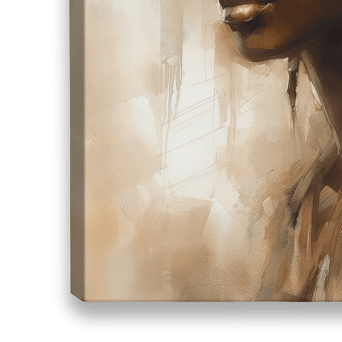 Ein schönes digitales Kunstwerk einer afrikanischen Frau, umgeben von Beige und Gold. Die Frau strahlt Stärke und Schönheit aus, während sie gleichzeitig ein Gefühl von Geheimnis und Intrige hervorruft. Die Farben des Bildes sind subtil und raffiniert, mit einem Schwerpunkt auf Gold- und Beigetönen, die ein luxuriöses Gefühl vermitteln.…