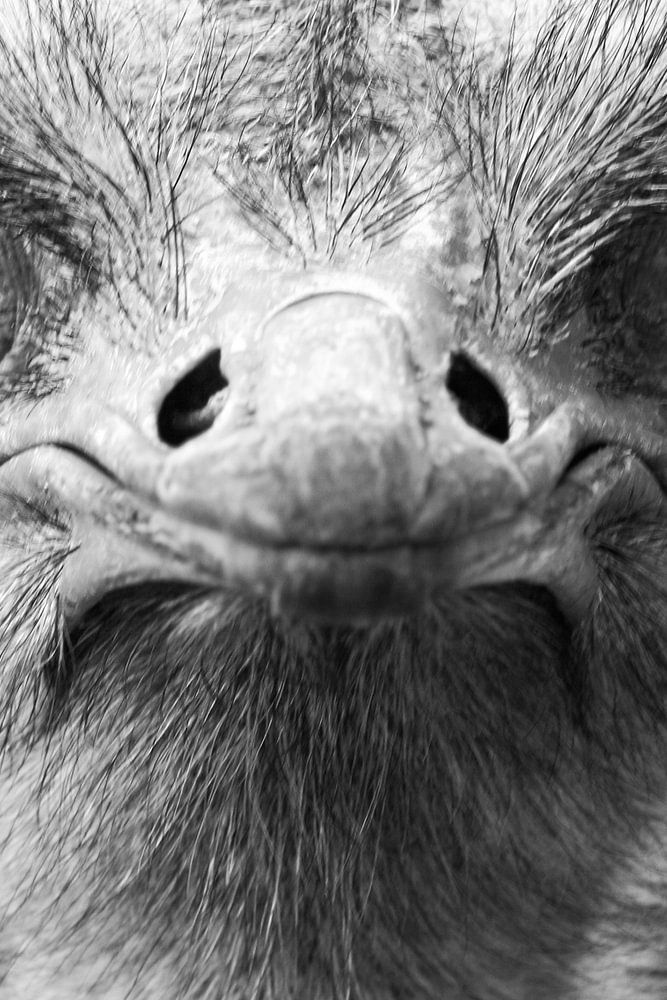 Porträt eines Afrikanischer Straußes in Schwarzweiss.