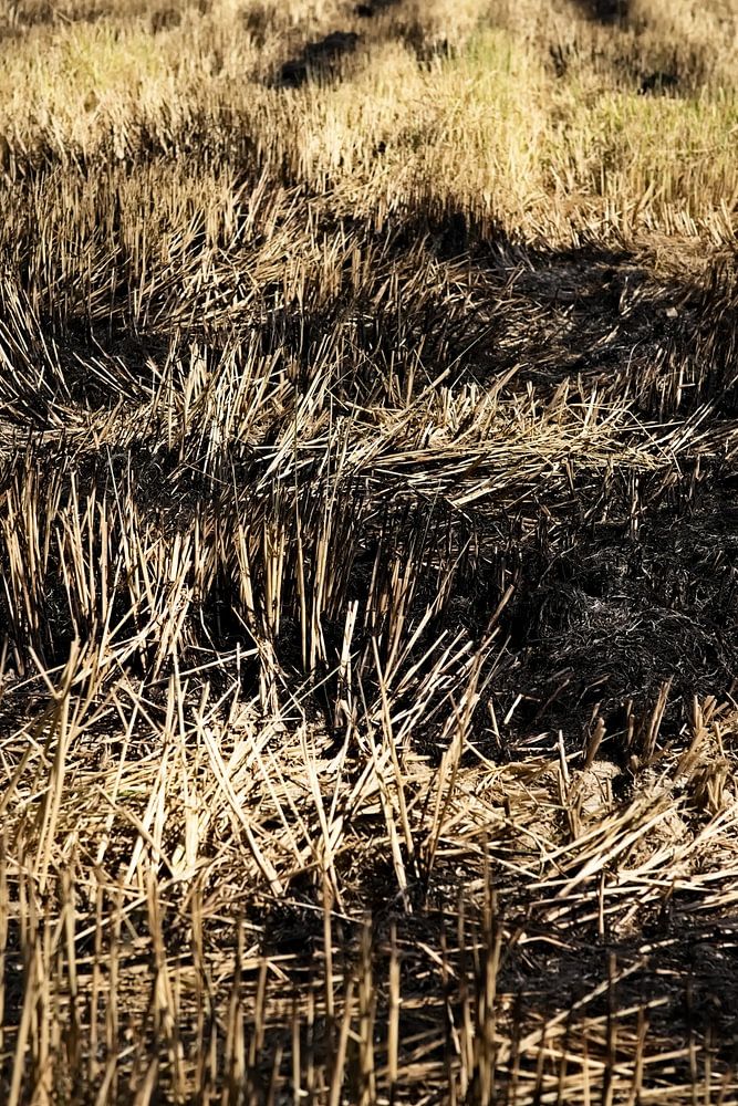 Der Kontrast zwischen den noch sichtbaren goldenen Stängeln und den dunklen, von der Verbrennung gezeichneten Bereichen ist stark. Im Hintergrund trennt eine kräftigere grüne Linie das Feld vom blauen Himmel und den sorgfältig aufgereihten Bäumen, die eine Straße oder Wohnhäuser zu schützen scheinen. Diese Landschaft verkörpert sowohl die Härte der landwirtschaftlichen Arbeit als auch die Harmonie der natürlichen Zyklen.