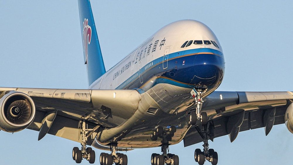 China Southern A380 kurz vor der Landung auf dem Flughafen Schiphol. Aufgenommen mit der aufgehenden Sonne in meinem Rücken.