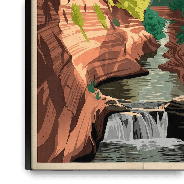 Ein harmonisches Zusammenspiel aus sanften Grün- und Erdtönen lädt zu einem Moment der Ruhe ein. Der sanft plätschernde Wasserfall und die majestätischen Felsformationen verkörpern die Schönheit der Natur. Dieses Kunstwerk verschönert perfekt ein Wohnzimmer oder Büro, indem es eine entspannende und inspirierende Atmosphäre schafft.