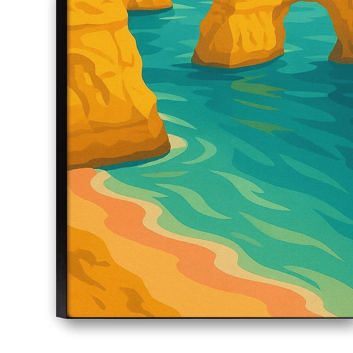 Dieses Reiseposter der portugiesischen Algarveküste fängt die atemberaubenden Meereslandschaften und goldenen Klippen eines der beliebtesten Küstenziele Europas ein. Das Kunstwerk zeigt türkisfarbenes Wasser, dramatische Kalksteinformationen und einen strahlenden Himmel, der die Schönheit der portugiesischen Südküste widerspiegelt. Mit seinem vom Art Deco inspirierten Design und der warmen, sonnengetränkten Farbpalette bringt dieses Wandbild von der Algarve ein Gefühl von Fernweh und Entspannung in jeden Raum. Perfekt für Strandliebhaber, Meeresträumer und alle, die sich von mediterranen Landschaften inspirieren lassen, verbindet dieser Druck Vintage-Reiseästhetik mit moderner Kunstfertigkeit. Die Algarveküste ist berühmt für ihre versteckten Buchten, malerischen Bögen und endlosen Sonnenschein, und dieses Poster destilliert diese Essenz in ein zeitloses Design. Ob im Wohnzimmer, im Schlafzimmer oder im Büro, es bietet eine sofortige Flucht zu den Klippen und Stränden von Portugal. Ergänzen Sie Ihre Wandkollektion mit diesem Poster der Algarveküste Portugals und verleihen Sie ihr einen Hauch von Vintage-Charme und Küstenruhe.