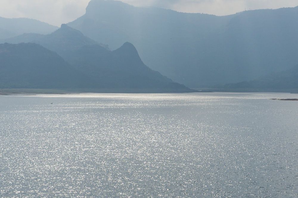 Der riesige Aliyar-Stausee in der Nähe von Valparai, Indien, mit einem Boot im Vordergrund und Bergen im Hintergrund.