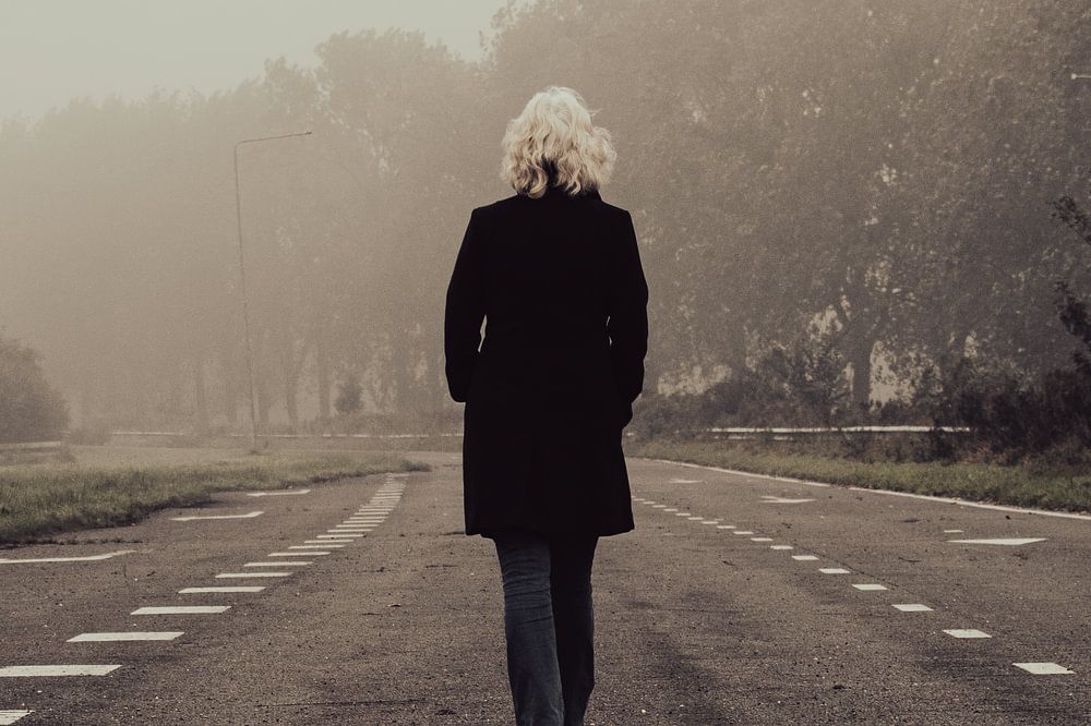 Dieses stimmungsvolle Foto zeigt eine Frau mit weißem Haar, die eine verlassene mehrspurige Straße entlanggeht. Die Straße ist von Bäumen gesäumt und verschwindet langsam im Nebel. Der Himmel ist grau und schwer, was zu der geheimnisvollen und introspektiven Atmosphäre beiträgt. Auffallend ist die Einsamkeit der Figur, die genau in der Mitte der Straße geht - eine kleine Person in einer großen, leeren Landschaft.