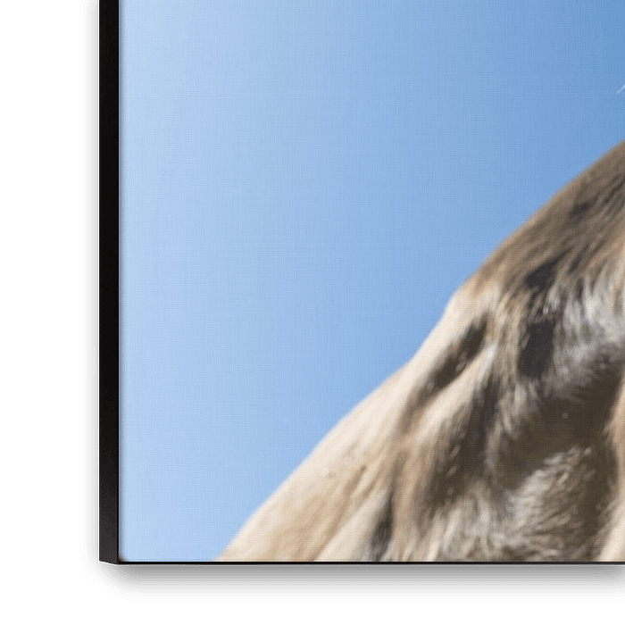 Unter dem makellos blauen Himmel des Allgäus neigt sich ein neugieriges Braunvieh herab, als wolle es den Betrachter direkt in seine sanfte, klare Welt einladen. Seine große, warme Schnauze füllt den Vordergrund, ein überraschend zarter Mittelpunkt in dieser weitläufigen Landschaft. In den dunklen Augen spiegelt sich ein stiller, gutmütiger Funken – der ruhige Geist eines Tieres, das die Berge und Wiesen kennt wie ein altes Lied.