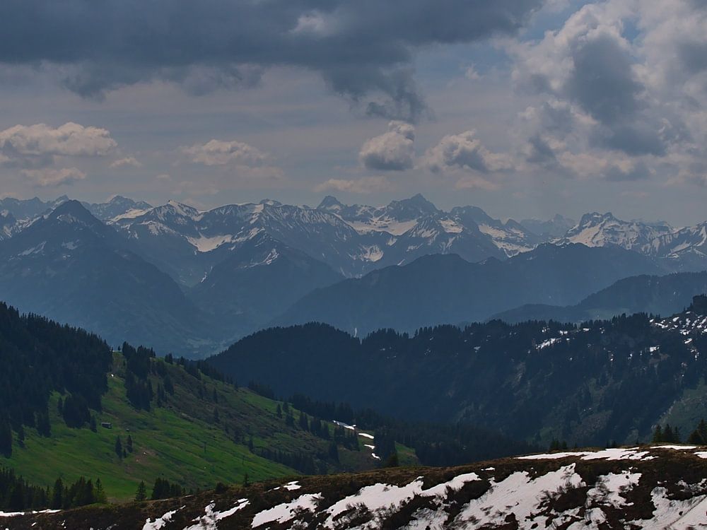 Panoramablick über die Allgäuer Alpen bei Oberstdorf, Bayern, Deutschland im Frühsommer mit Schneeresten an den Hängen und bewölktem Himmel vom Großen Ochsenkopf aus gesehen.