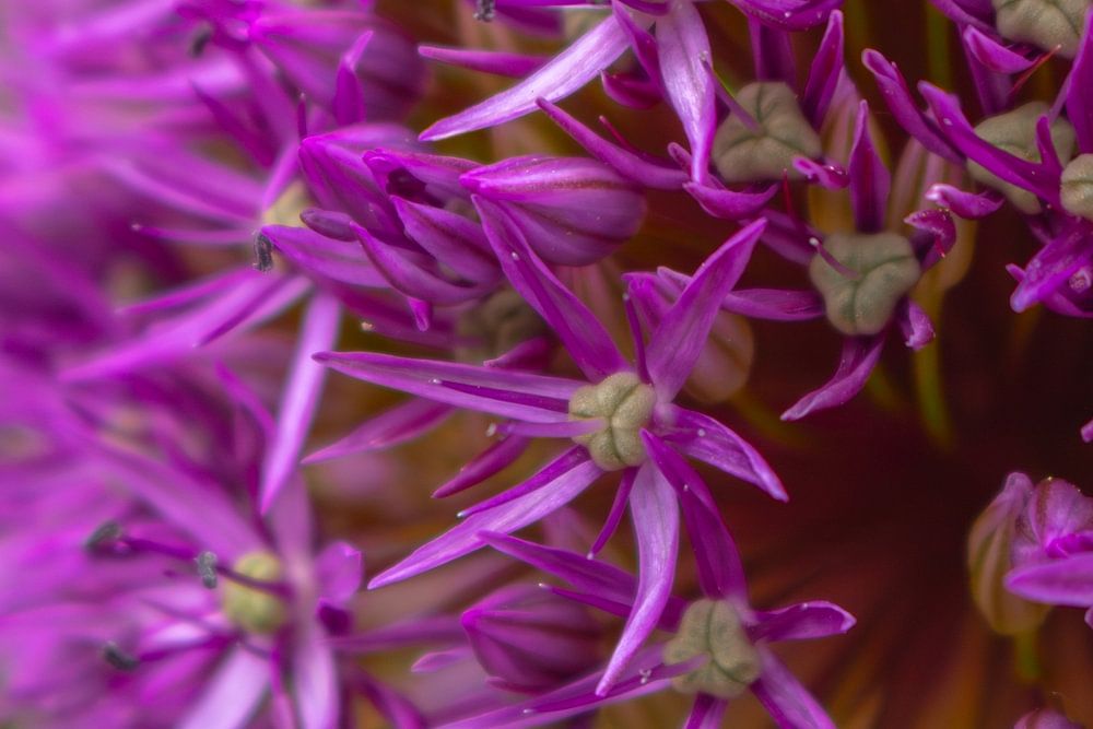 Das Bild zeigt eine Nahaufnahme einer Alliumblüte der Sorte purple sensation. Die kugelförmige Blüte setzt sich aus zahlreichen kleinen, sternförmigen Einzelblüten zusammen, die in einem kräftigen Violett leuchten. Die dichte Anordnung der Blüten erzeugt eine fast skulpturale Wirkung, die durch die klare Fokussierung und den reduzierten Hintergrund zusätzlich betont wird.