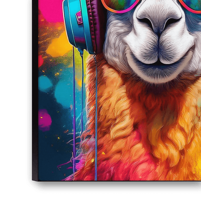 Ein buntes Porträt eines Alpakas mit Kopfhörern und Sonnenbrille, das in der Disco Musik hört. Die Farben sind knallig, frech und modern. Das Bild wurde mit ai erstellt.