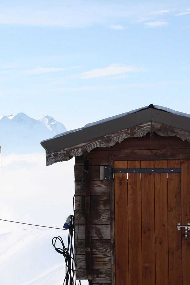 Auf dem Gipfel des Berges während einer Skitour auf der Alpe d'Huzes kann dieses schöne Bild aufgenommen werden. Frieden und Ruhe... ein anderer Skifahrer, der vorbeikommt.