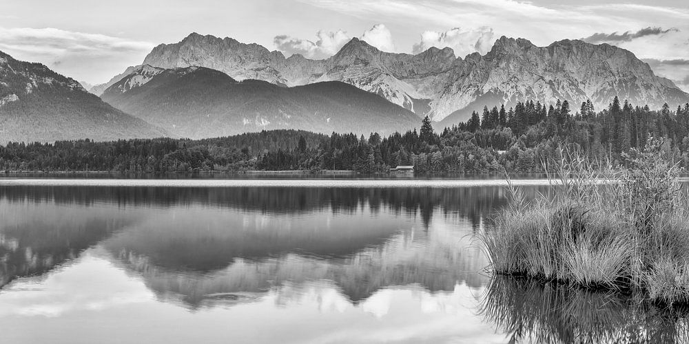 Berge in den Alpen in Bayern mit Karwendel Alpenglühen. Schwarzweiss 90210135ays