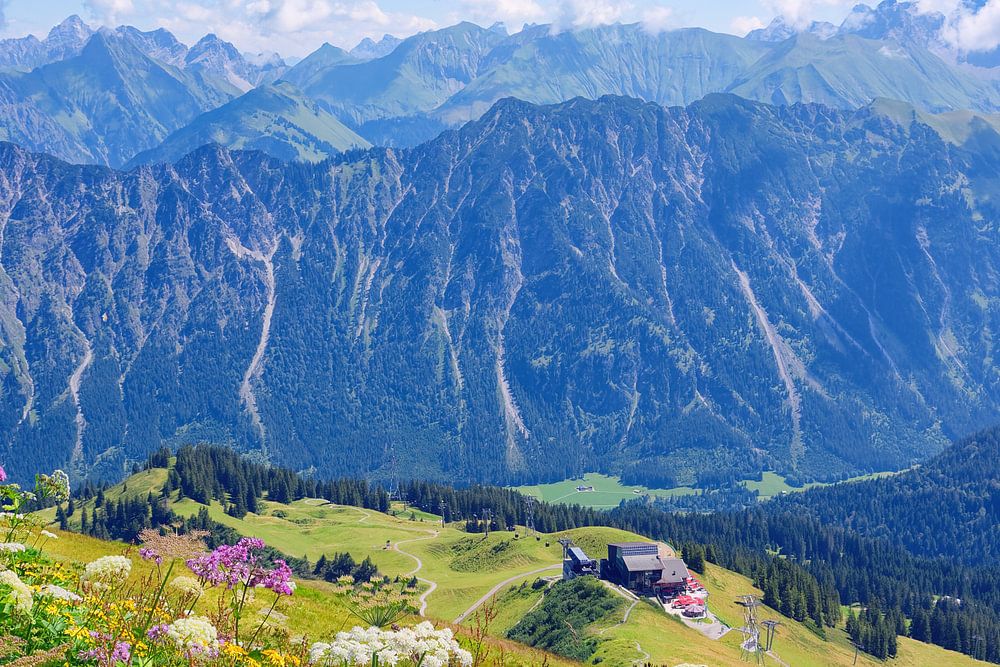 Vom Fellhorn bietet sich ein weiter Blick über das Stillachtal zum Allgäuer Hauptkamm. Oberallgäu, Oberstdorf, Allgäu, Schwaben, Bayern, Deutschland. Aufgenommen im Sommer 2020.