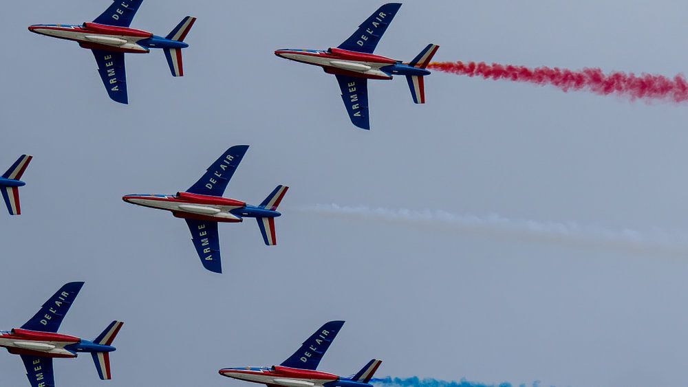 Die Diamantformation der Patrol de France der französischen Luftwaffe mit ihrem Dassault Dornier AlphaJet während des RIAT bei RAF Fairford.