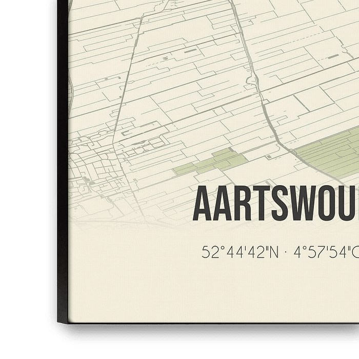 Retrokarte von Aartswoud, gelegen in der Gemeinde Opmeer, Provinz Nordholland. Die Karte zeigt öffentliche Straßen, Wasserläufe (Seen, Bäche und Gräben) und Wälder in und um Aartswoud. Darüber hinaus enthält die Karte die Koordinaten von Aartswoud.