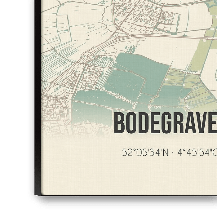 Retrokarte von Bodegraven, gelegen in der Gemeinde Bodegraven-Reeuwijk, Provinz Südholland. Die Karte zeigt öffentliche Straßen, Wasserläufe (Seen, Bäche und Gräben) und Wälder in und um Bodegraven. Darüber hinaus enthält die Karte die Koordinaten von Bodegraven.