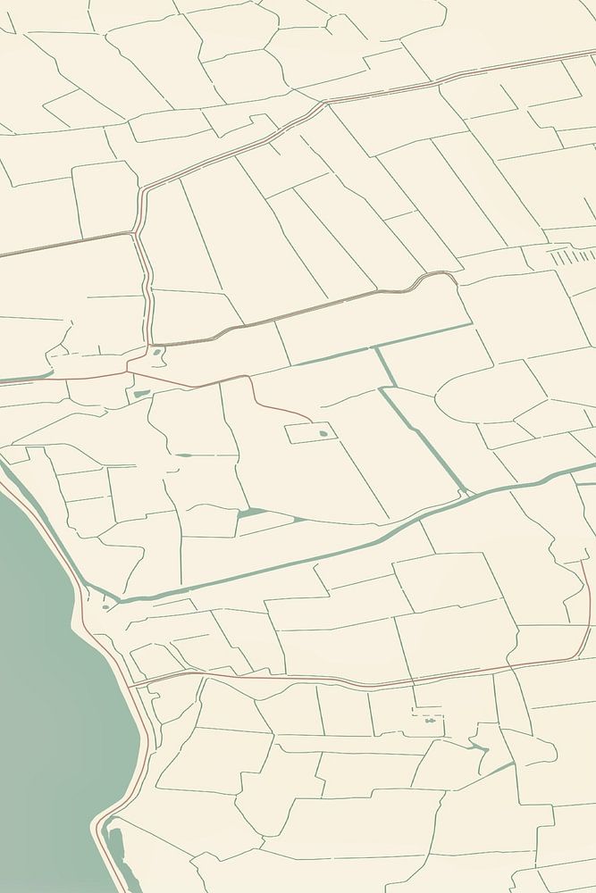 Retrokarte von Cornwerd, gelegen in der Gemeinde Sudwest-Fryslan, Provinz Fryslan. Die Karte zeigt öffentliche Straßen, Wasserläufe (Seen, Bäche und Gräben) und Wälder in und um Cornwerd. Darüber hinaus enthält die Karte die Koordinaten von Cornwerd.