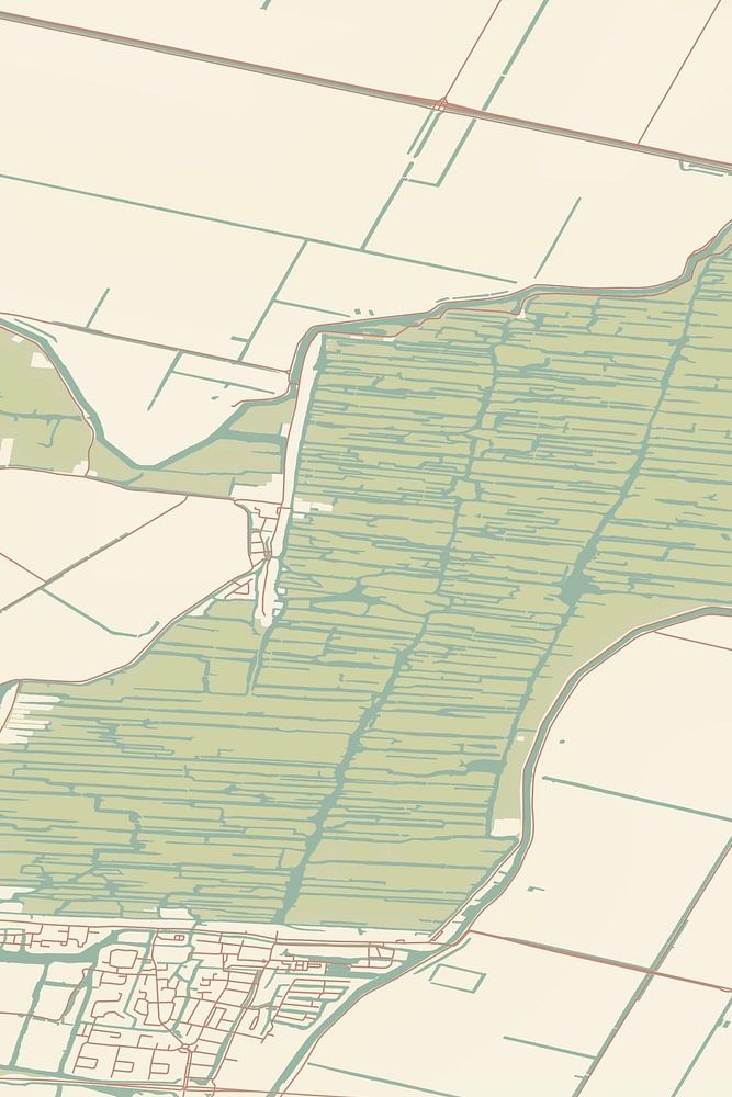 Retrokarte von Grootschermer, gelegen in der Gemeinde Alkmaar, Provinz Nordholland. Die Karte zeigt öffentliche Straßen, Wasserläufe (Seen, Bäche und Gräben) und Wälder in und um Grootschermer. Darüber hinaus enthält die Karte die Koordinaten von Grootschermer.