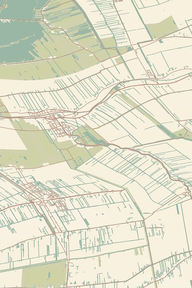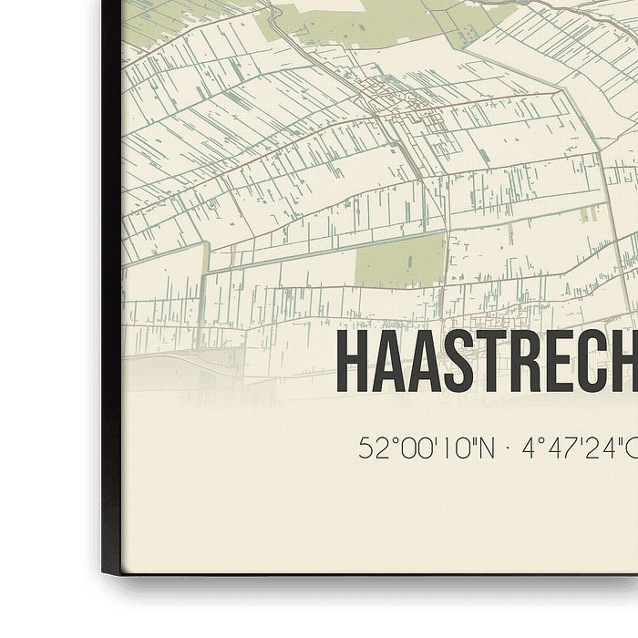Retrokarte von Haastrecht, gelegen in der Gemeinde Krimpenerwaard, Provinz Südholland. Die Karte zeigt öffentliche Straßen, Wasserläufe (Seen, Bäche und Gräben) und Wälder in und um Haastrecht. Darüber hinaus enthält die Karte die Koordinaten von Haastrecht.