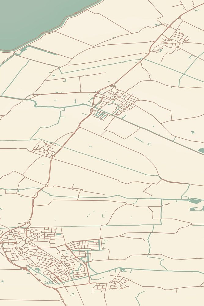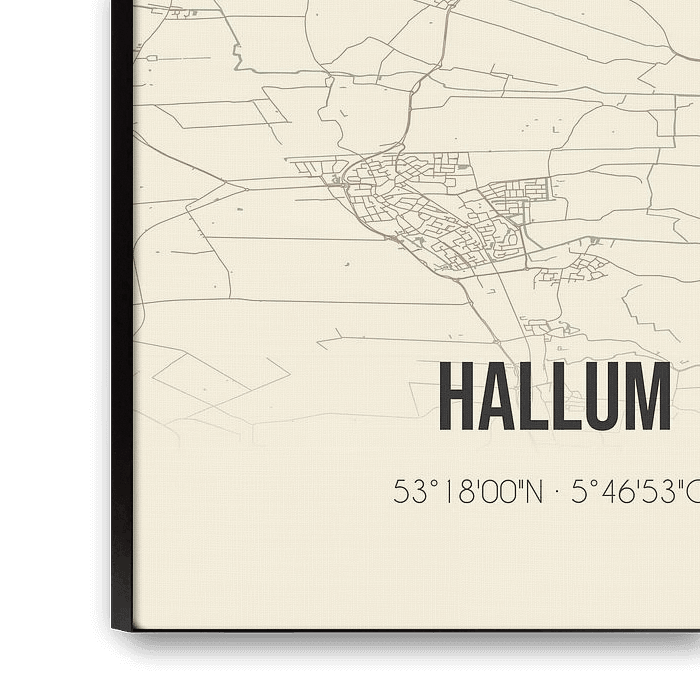 Retrokarte von Hallum, gelegen in der Gemeinde Noardeast-Fryslan, Provinz Fryslan. Die Karte zeigt öffentliche Straßen, Wasserläufe (Seen, Bäche und Gräben) und Wälder in und um Hallum. Darüber hinaus enthält die Karte die Koordinaten von Hallum.