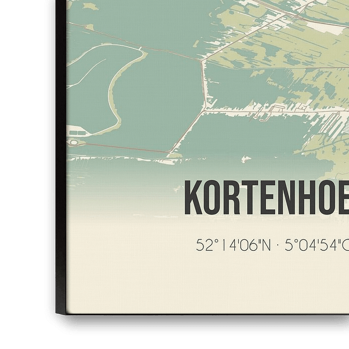 Retrokarte von Kortenhoef, gelegen in der Gemeinde Wijdemeren, Provinz Nordholland. Die Karte zeigt öffentliche Straßen, Wasserläufe (Seen, Bäche und Gräben) und Wälder in und um Kortenhoef. Darüber hinaus enthält die Karte die Koordinaten von Kortenhoef.